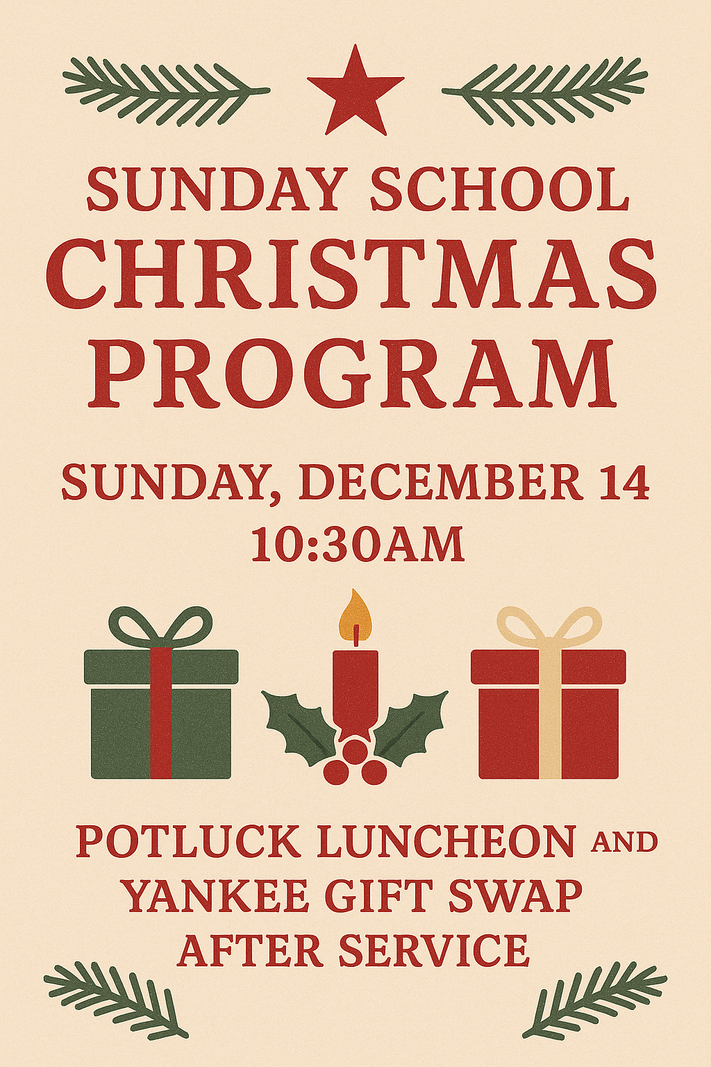 9:30 AM Sunday School for all ages; 10:30 AM: Worship Service